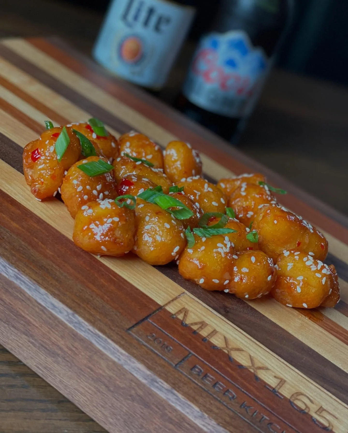 Our cheese curds get a spicy-sweet twist with a drizzle of sweet chili sauce, toasted sesame seeds, and sliced scallions for a bright, flavorful finish.